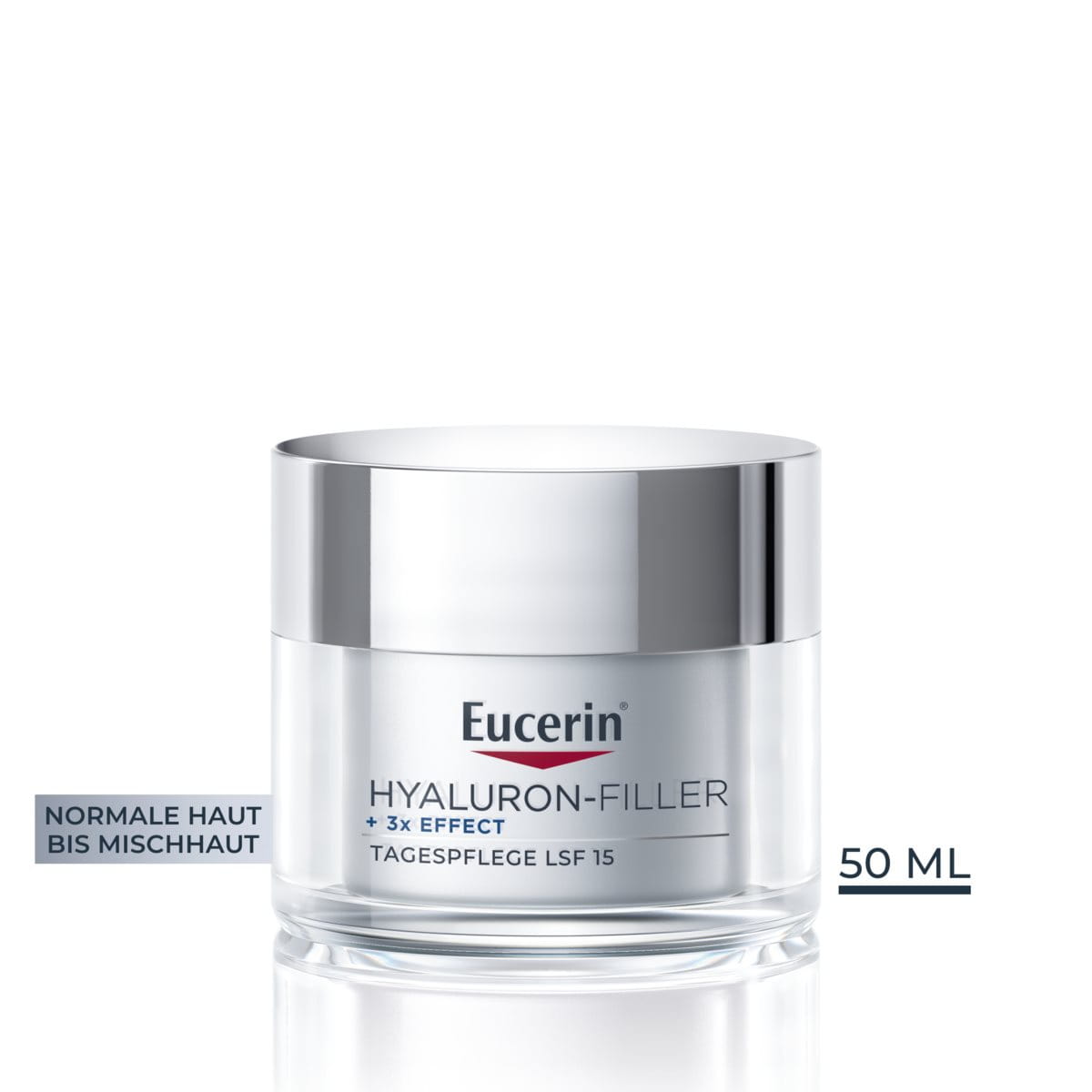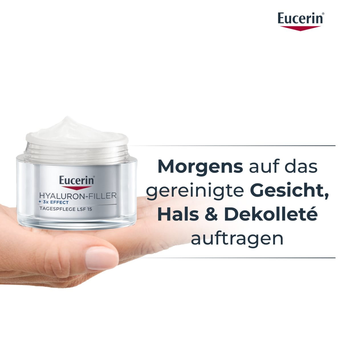 Hyaluronsäure ist eine natürlich vorkommende Substanz in der Haut, die dazu beiträgt, die Feuchtigkeit zu speichern und die Haut glatt, prall und hydratisiert zu halten. Mit der Zeit nimmt der natürliche Hyaluronsäuregehalt der Haut ab, was zu feinen Linien und tieferen Falten führt.Die Eucerin Hyaluron-Filler + 3x Effect Pflegeserie wurde speziell entwickelt, um den ersten Anzeichen der Hautalterung, wie feinen Linien und tieferen Falten, entgegenzuwirken. Diese Anzeichen treten typischerweise um das 30. Lebensjahr herum auf, was auf genetische Faktoren und den Lebensstil zurückzuführen ist. Die Eucerin Hyaluron-Filler Tagespflege LSF 15 ist eine Anti-Age-Tagescreme, die Mikro- und Makro-Hyaluronsäure kombiniert, um die Haut auf verschiedenen Ebenen mit Feuchtigkeit zu versorgen, Falten sichtbar aufzupolstern und gleichzeitig langanhaltende Feuchtigkeit zu bewahren.
