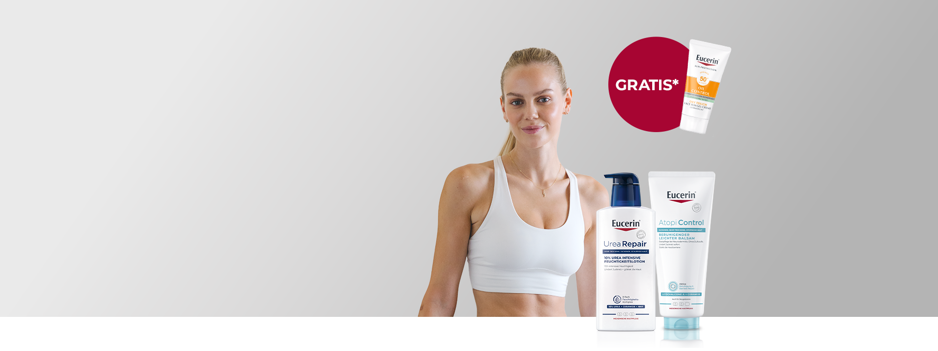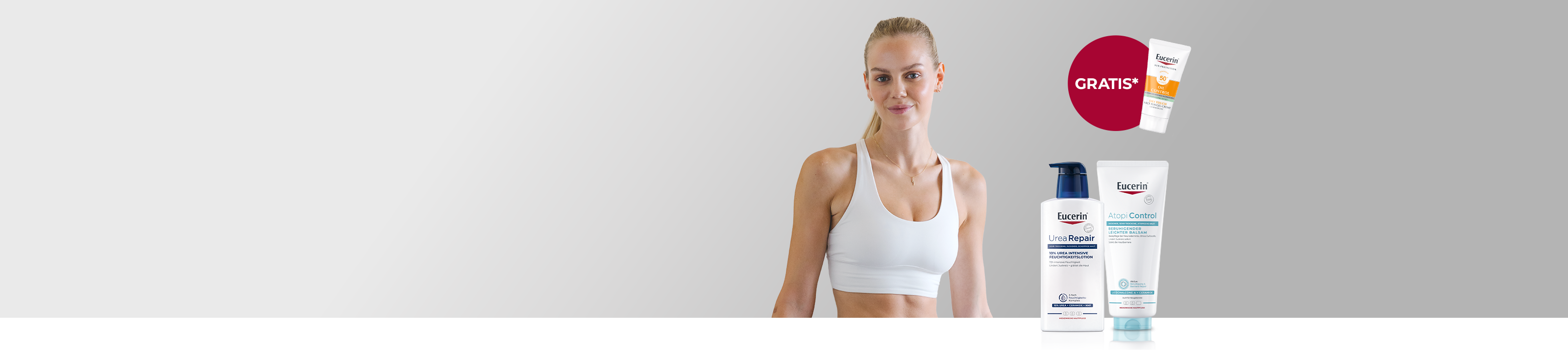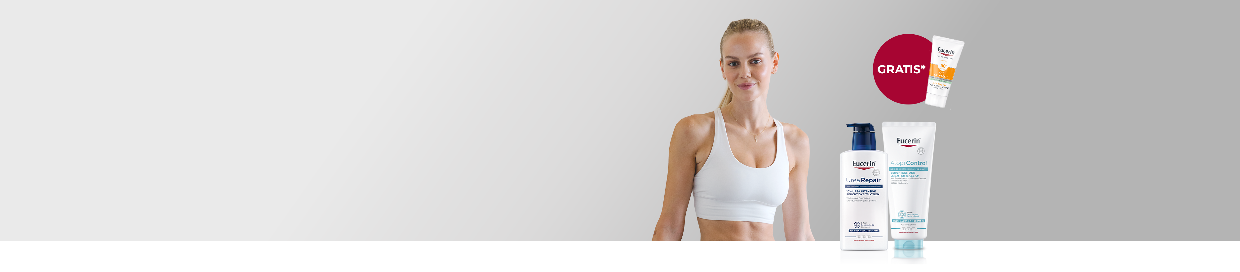 *Beim Kauf von Eucerin® Körperpflegeproduktes inkl. Reinigung. Ausgenommen sind Hand-, Lippen-, und Fußpflegeprodukte. Nur ein Gratisprodukt pro Kaufakt und nur solange der Vorrat reicht.