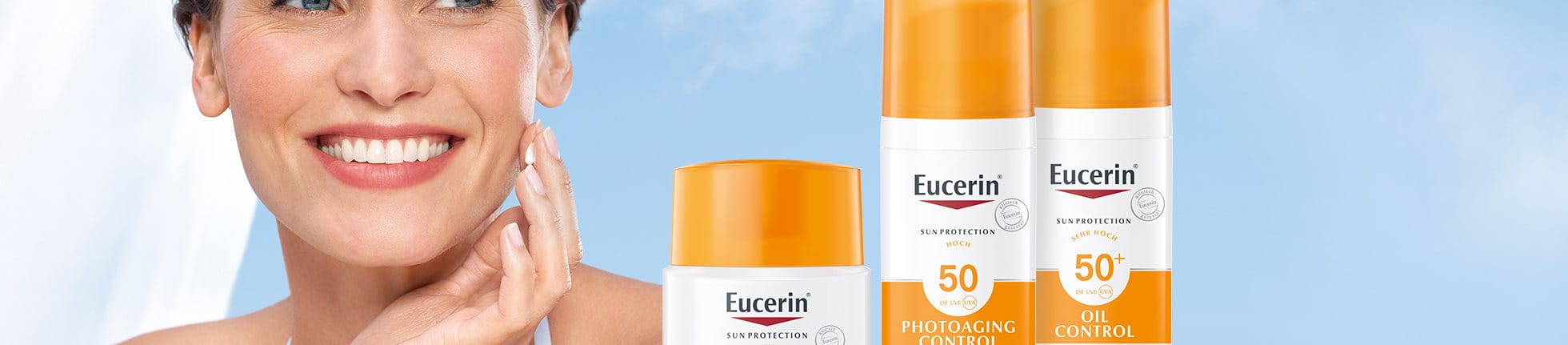 Die Sonne ist für 90 % der vorzeitigen Hautalterung verantwortlich2. Alle Eucerin Sun Gesichtsprodukte schützen die Haut vor Photoageing – doch wenn Ihre Haut Anzeichen von vorzeitiger Hautalterung aufweist, probieren Sie Eucerin Photoaging Control Face Sun Fluid LSF 50+ oder LSF 30. Die Formel enthält kurz- und langkettige Hyaluronsäure, um Falten zu glätten und die Anzeichen von Hautalterung sichtbar zu reduzieren. Wenn Sie ein getöntes Produkt bevorzugen, probieren Sie Eucerin Photoaging Control Face CC Creme getönt LSF 50+ hell oder mittel. Die darin enthaltenen Farbpigmente verleihen sofortigen gleichmäßigen Teint.