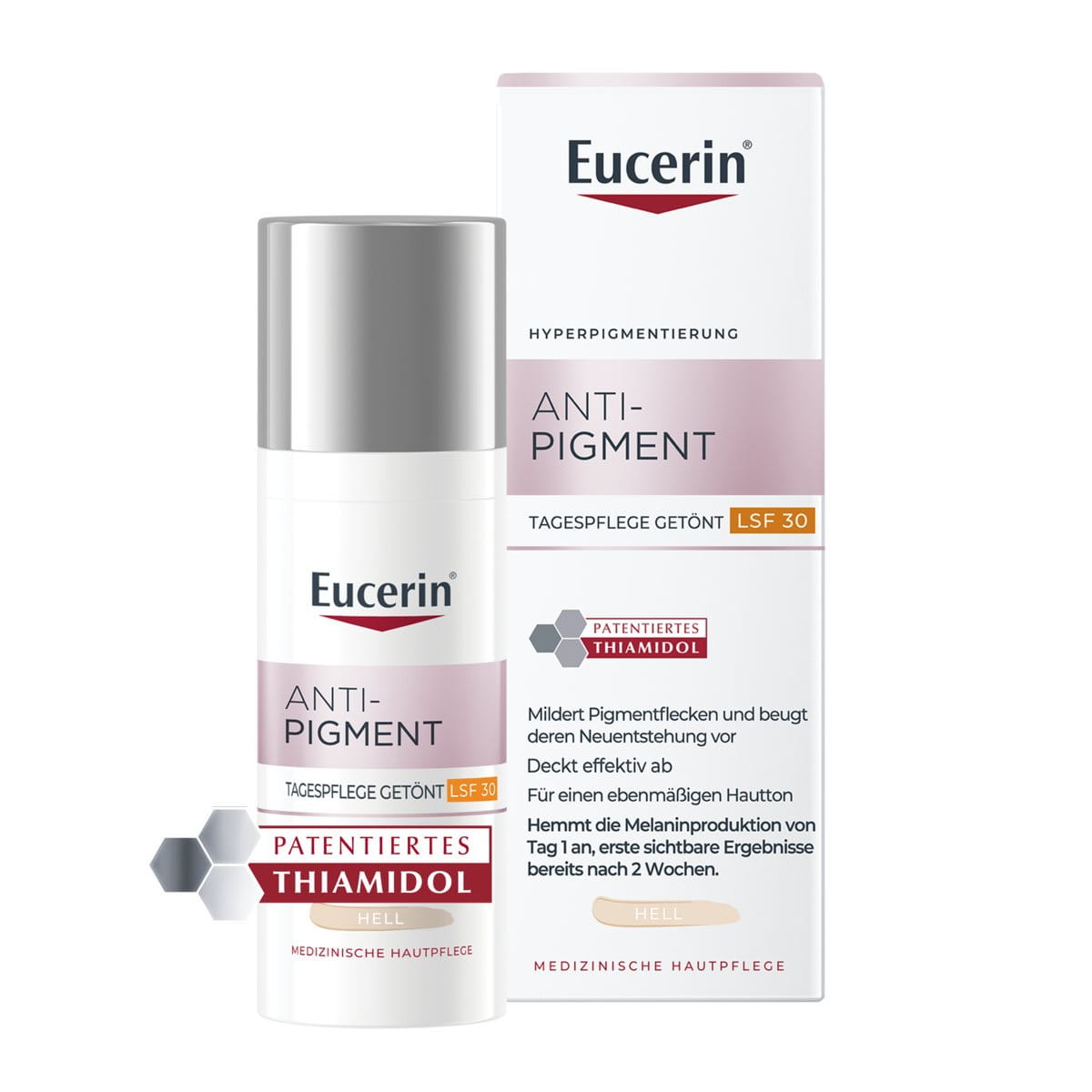 Alle Produkte – eine Tagespflege, eine Nachtpflege, ein DualSerum, ein Korrekturstift, eine Augenpflege und ein teintperfektionierendes Serum – enthalten Thiamidol, einen effektiven und patentierten Pflegewirkstoff, der auf die Melaninproduktion an ihrem Ursprung einwirkt. Eucerin Anti-Pigment lässt Pigmentflecken nach und nach verblassen und beugt ihrer Neuentstehung vor. Klinische und dermatologische Studien belegen die sehr gute Wirksamkeit und Hautverträglichkeit der Anti-Pigment Produkte. Erste Ergebnisse sind bereits nach 2 Wochen sichtbar. Bei weiterhin regelmäßiger Anwendung verbessert sich der Hautton zusehends weiter.**