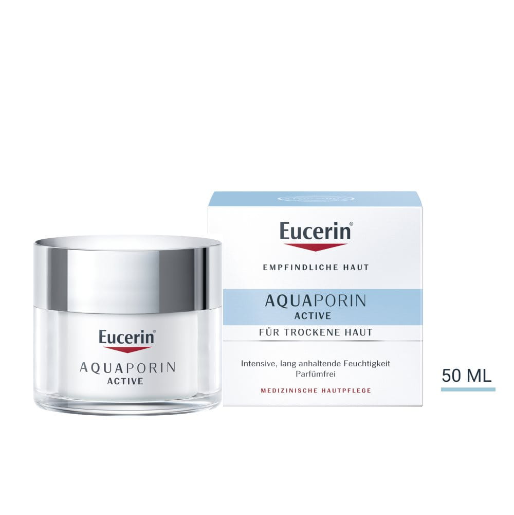 Die reichhaltige Feuchtigkeitscreme Eucerin AquaPorin Active versorgt trockene und empfindliche Gesichtshaut intensiv und langanhaltend mit Feuchtigkeit. Für geschmeidige, gepflegte und strahlend schöne Gesichtshaut ist ein ausgeglichener Feuchtigkeitshaushalt essentiell. AquaPorin Active enthält naturidentisches Gluco-Glycerol, das die Aktivierung der hauteigenen Feuchtigkeitskanäle, der Aquaporine, fördert. Das Feuchtigkeitsnetzwerk dieser Aquaporine unterstützt den Ausgleich des Feuchtigkeitshaushaltes der Haut von innen heraus. So lindert die Gesichtscreme Spannungsgefühle und versorgt die Haut 24h intensiv mit Feuchtigkeit.