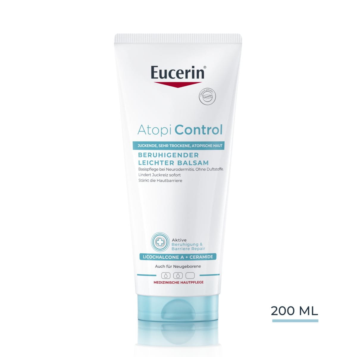 Der Eucerin AtopiControl Beruhigender Leichter Balsam für die tägliche Basispflege, der speziell dafür entwickelt wurde, gereizte, trockene und juckende Haut zu beruhigen und intensiv Feuchtigkeit zu spenden. Der leichte, aber pflegende Öl-in-Wasser-Balsam ist mit beruhigendem Licochalcone A, Ceramiden und Sheabutter angereichert, um die Hautbarriere zu stärken und Trockenheit und Juckreiz zu lindern. Er kann außerdem während einer Schubphase neben der Eucerin AtopiControl Akutpflege Creme, dem Eucerin Anti-Juckreiz Spray und der gewohnten Medikation verwendet werden. Die Haut fühlt sich weich und geschmeidig an. Der Hautzustand wird mit regelmäßiger Anwendung spürbar verbessert. Der Körperbalsam enthält keine Duftstoffe und hat eine leichte und angenehme Textur, welche einfach zu verteilen ist, schnell einzieht und nicht klebt.
