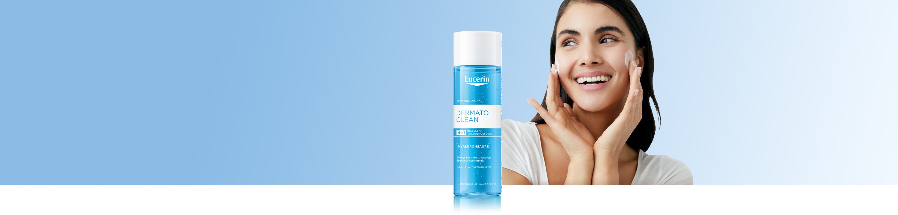 DermatoClean [Hyaluron] von Eucerin ist eine Gesichtsreinigungs-Serie, die für alle Hauttypen und Reinigungsanforderungen geeignet ist. Der erste Schritt einer wirkungsvollen Gesichtspflege ist die gründliche Reinigung. Es ist wissenschaftlich erwiesen, dass gut gereinigte und mit Feuchtigkeit versorgte Haut Sauerstoff und Wirkstoffe der anschließenden Pflege besser aufnehmen kann. Die innovative Kombination naturidentischer Inhaltsstoffe entfernt Make-up restlos von der Haut, während durch die enthaltene Hyaluronsäure gleichzeitig der natürliche Feuchtigkeitsausgleich gefördert wird. Mit Eucerin DermatoClean [Hyaluron] gereinigte Haut ist sauber, weich, beruhigt, erfrischt und bereit zur Regeneration.