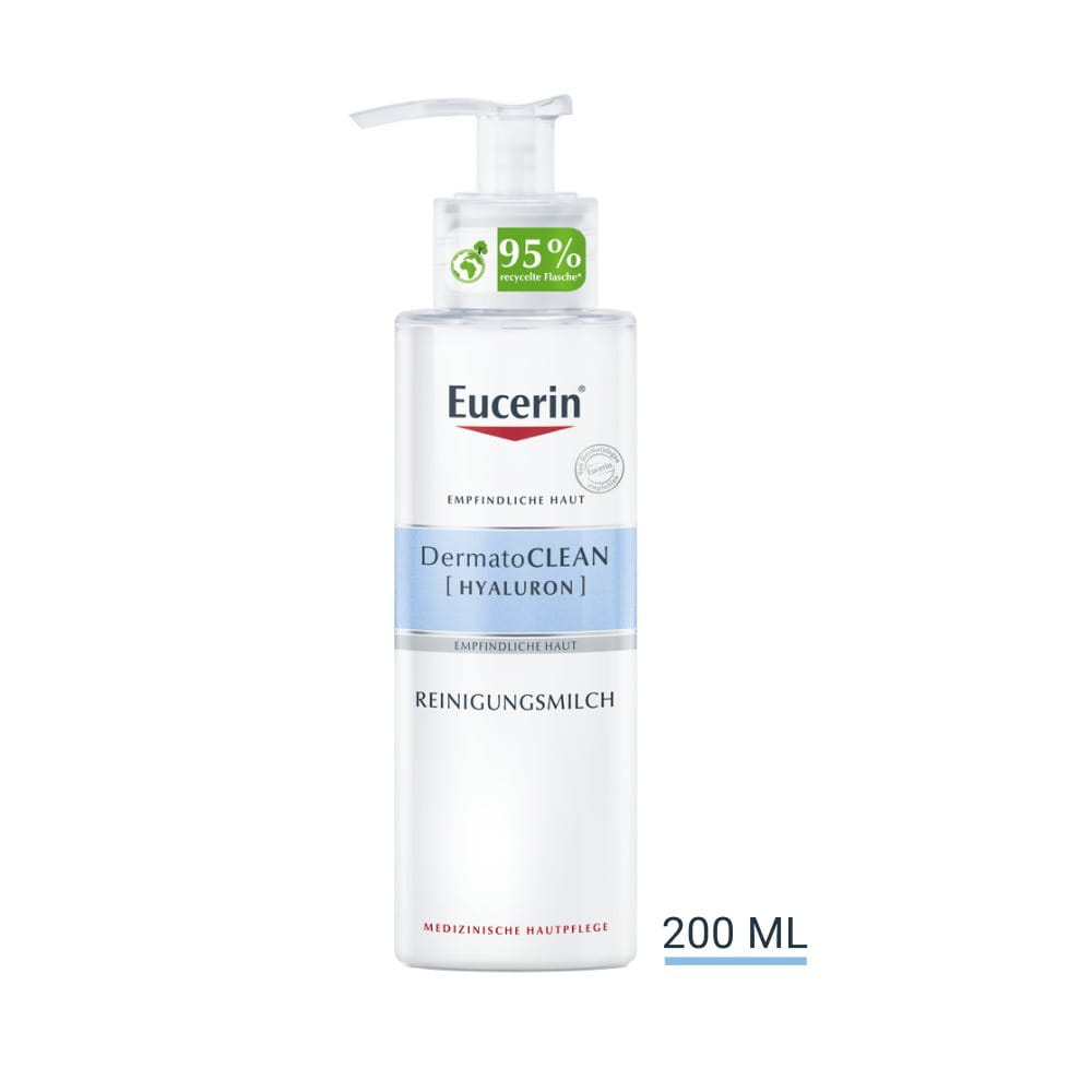 Die Eucerin DermatoClean [Hyaluron] Reinigungsmilch hinterlässt ein sauberes, beruhigtes und weiches Hautgefühl und eignet sich bestens für die tägliche Reinigung von trockener und empfindlicher Haut – klinisch und dermatologisch erwiesen.
