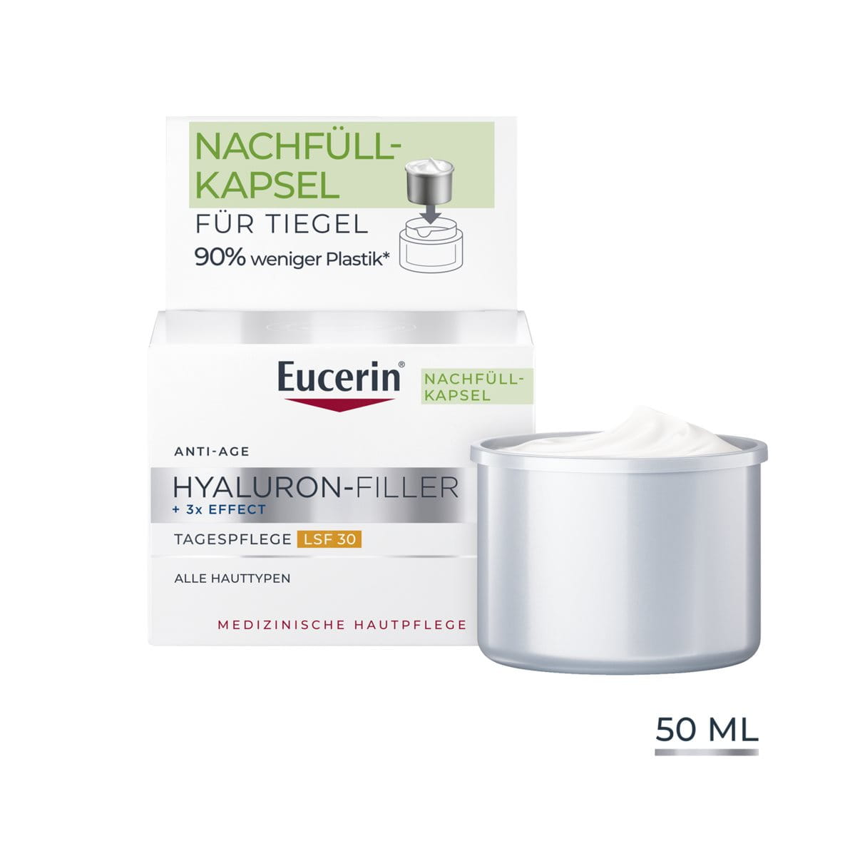 Mit der neuen Nachfüllkapsel setzt Eucerin ein Zeichen für mehr Nachhaltigkeit in der Gesichtspflege: Die Kapsel passt in alle Eucerin Gesichtspflege-Tiegel, lässt sich einfach einsetzen und besteht aus bis zu 90 % weniger Plastik im Vergleich zur Originalverpackung. So bleibt die gewohnte Pflegequalität erhalten – bei deutlich reduziertem Verpackungsaufwand.