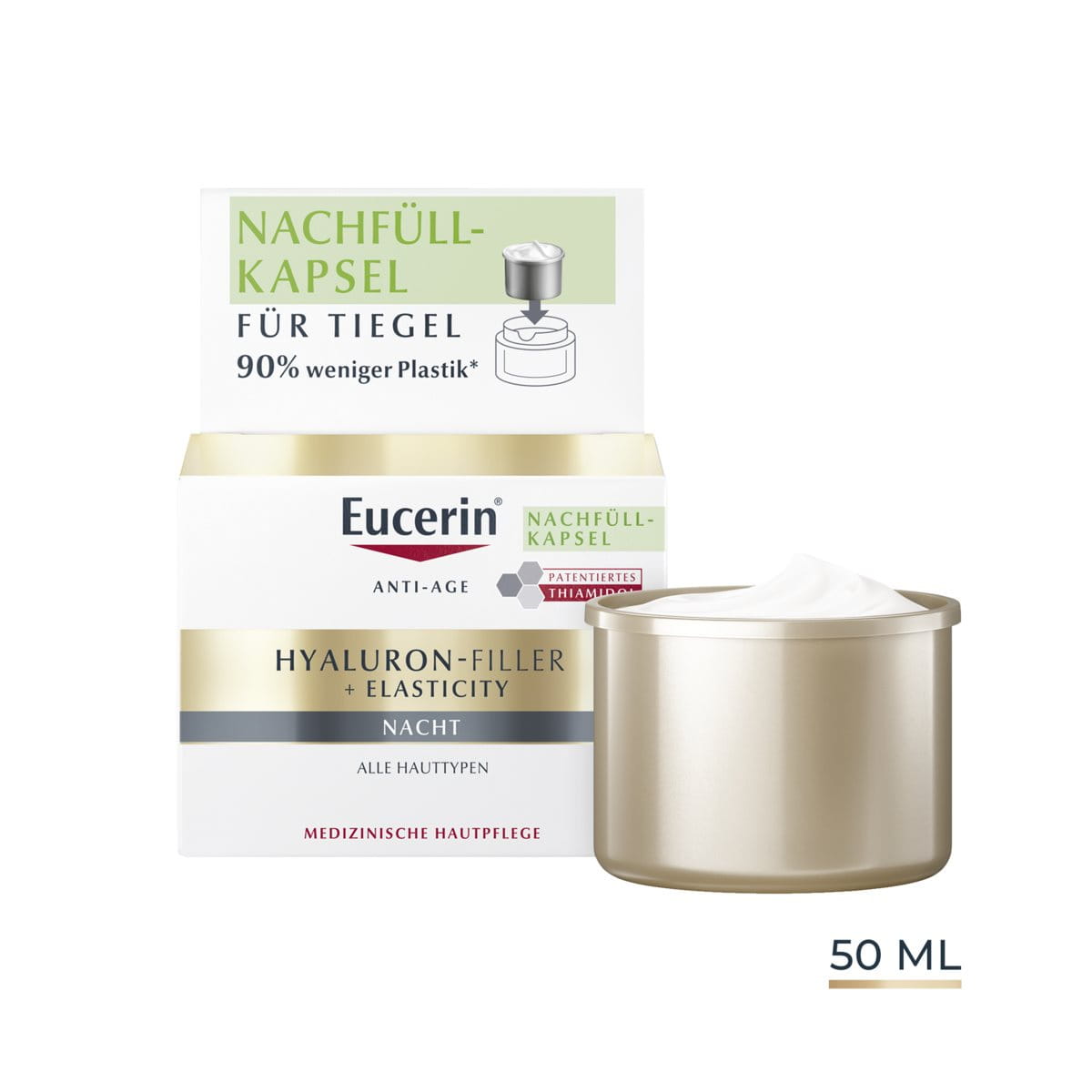 Mit der neuen Nachfüllkapsel setzt Eucerin ein Zeichen für mehr Nachhaltigkeit in der Gesichtspflege: Die Kapsel passt in alle Eucerin Gesichtspflege-Tiegel, lässt sich einfach einsetzen und besteht aus bis zu 90 % weniger Plastik im Vergleich zur Originalverpackung. So bleibt die gewohnte Pflegequalität erhalten – bei deutlich reduziertem Verpackungsaufwand.