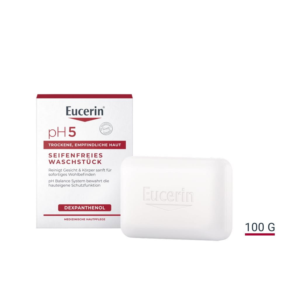 Trockene, empfindliche Haut braucht eine besonders milde Reinigung, die die Widerstandskraft gegenüber äußeren Reizen bewahrt. Das pH5 Seifenfreie Waschstück (Syndet) mit Dexpanthenol (Provitamin B5) reinigt extra sanft und schützt das Hautmikrobiom. Die Formel mit dem pH Balance System hilft, den natürlichen pH-Wert der Haut zu stabilisieren. Das Eucerin pH5 Seifenfreies Waschstück ist für den täglichen Gebrauch an Körper, Gesicht und Händen und auch für Kinder ab drei Jahren geeignet.